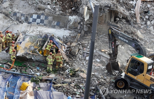 9일 오후 4시 22분께 광주 동구 학동에서 철거 공사 중인 5층 건물이 무너졌다는 신고가 119상황실에 접수됐다. 소방당국은 차량 3대 승객과 운전자를 포함해 철거 작업 중이던 근로자가 매몰된 것으로 추정하고 있다. 이 사고로 인근을 달리던 시내버스 한 대와 승용차 2대가 건물 붕괴 당시 건물은 비어 있었지만 현장 작업자나 승용차 탑승자, 보행자 등 추가 매몰자가 있을 가능성에 대비해 수색하고 있다. 사진은 사고 현장에서 119 구조대원들이 구조 작업을 펼치는 모습. 이 건물의 잔해가 운행 중이던 시내버스를 덮쳤고, 철거 작업자 일부가 매몰됐다는 신고 내용도 함께 접수됐다.